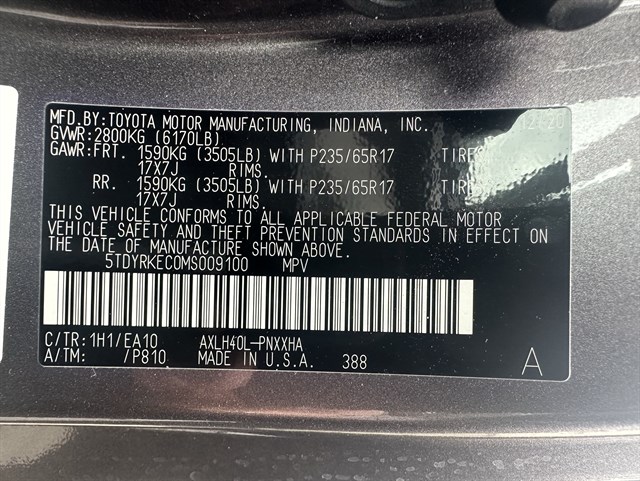 | VIN | 5TDYRKEC0MS009100 |